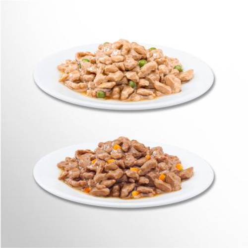 - Kurczak z grochem + Wołowina z marchwią w sosie