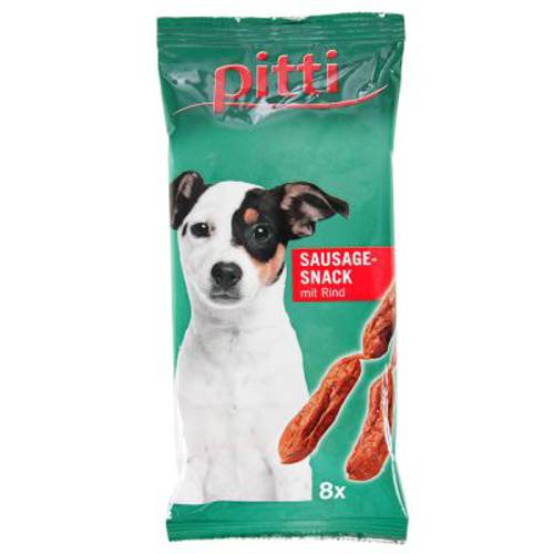 Małe suszone kiełbaski pitti, to mini kabanosiki wołowe dla psa, w 90% ze świeżego mięsa, bez dodatku cukru. Snak ten odpowiedni jest dla psów wszystkich klas wiekowych, gdyż jego miękka wilgotnawa konsystencja, sparawia, że kiełbaski są łatwe do gryzienia.Doskonała forma nagrody lub smakołyk pomiędzy posiłkami!