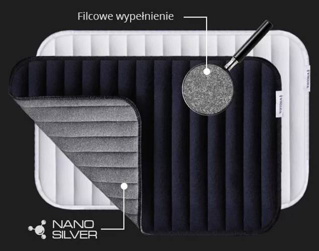 Unikatowa struktura materiału w połączeniu z warstwą filcu efektywnie odprowadza pot i wilgoć. Jony srebra redukują też nieprzyjemny zapach, dzięki czemu podkłady dłużej utrzymują świeżość. Oprócz tego, wielowarstwowa struktura doskonale chroni przed uderzeniami na całej powierzchni, osłaniając nogi Twojego konia podczas treningu. Odpowiednie pranie podkładów pozwala zachować ich właściwości i niezmienny wygląd nawet po wielokrotnym praniu.