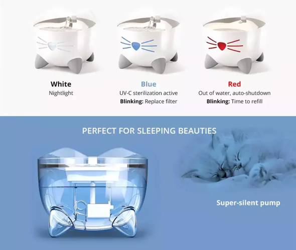 • Super cicha i całkowicie odłączana pompa - ponieważ pompa fontannowa jest zawieszona w zbiorniku, pracuje bardzo cicho