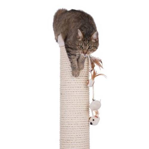 Różnorodne zabawki w postaci piłeczki, wrednej myszki oraz ptaszka zwisają na sizalowym sznurku i zachęcają Twojego pupila do figlowania i zabawy. Wyjątkowo masywna podstawa sprawia, że słupek stabilnie stoi na swoim miejscu, nawet w trakcie użytkowania przez koty dużych i ciężkich ras.