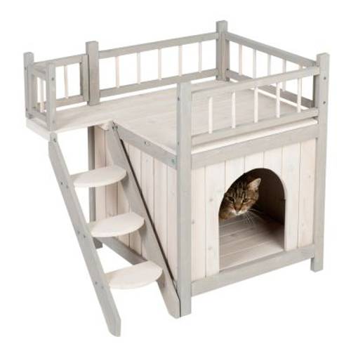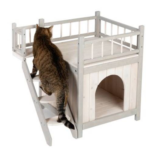 Bajeczny i wyjątkowy domek z tarasem na dachu: wymarzone gniazdko dla wymagających kotów i dla małych piesków, ze schodkami, kolor szaro-biały