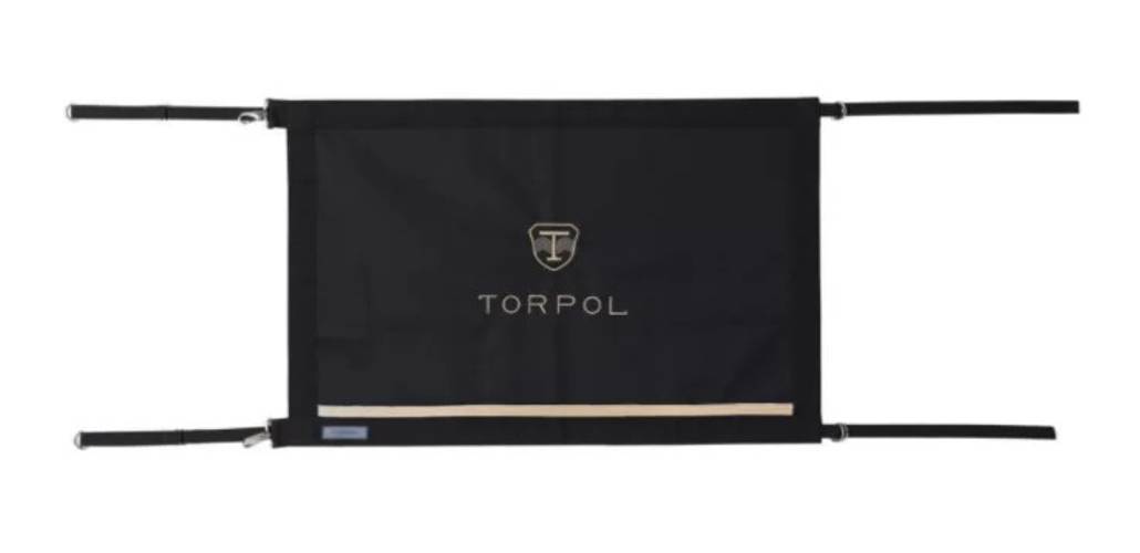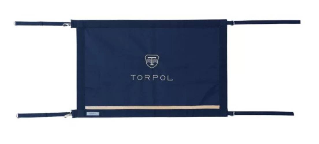 Prostokąt Stajenny Torpol® Design Wykonany z odpornego na zabrudzenia ortalionu. Wykończony wytrzymałą taśmą. Posiada paski z regulatorami (po dwa z każdej strony), ułatwiające mocowanie na drzwiach boksu. Materiał: ortalion (100% poliester) Wykończenie: taśma nośna (100% poliester) Zdobien…