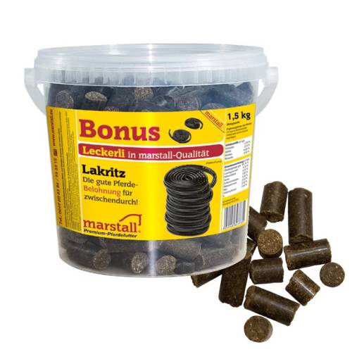 Przysmak Apfel-Karotte Marstall to smakołyk dla koni o intensywnym smaku lukrecji, z dużą zawartością włókna. Naturalny przysmak dla koni w formie pelletu. Dzięki wytłokom z jabłek, mączce z lucerny oraz melasy z trzciny cukrowej Lakritz ma wyjątkowy intensywny smak, lubiany przez konie. Ponadto, możesz być spokojny o zdrowie swojego konia, gdyż produkt nie zawiera cukru, sztucznych aromatów ani barwników.