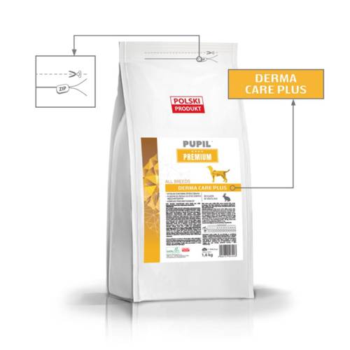 PUPIL PREMIUM DERMA CARE PLUS DLA PSÓW Z PROBLEMAMI ALERGICZNYMI I DERMATOZAMI TO ZBILANSOWANA I PEŁNOPORCJOWA KARMA.