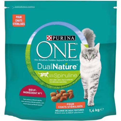 Pyszny smak i zbilansowana receptura: karma Purina ONE Dual Nature Sterilized, wołowina łączy w sobie wszystkie zalety, jakich oczekuje się od karmy pełnoporcjowej dla kotów po kastracji lub sterylizacji. Głównym składnikiem karmy Purina ONE Dual Nature Sterilized jest wołowina, dzięki czemu pokarm zaspokaja potrzeby żywieniowe gatunku.Karma dostarcza Twojemu pupilowi wysokowartościowe białka i inne składniki odżywcze, dzięki którym kot może prowadzić aktywne życie. Pokarm został wzbogacony spiruliną, pochodzącą z alg, będącą źródłem cennych dla organizmu substancji. Szczególną cechą karmy jest połączenie dwóch rodzajów krokietów: w opakowaniu znajdują się zarówno chrupiące, suche krokiety, jak też przepyszne, miękkie kawałki, które stanowią doskonałe urozmaicenie posiłku. Nawet wybredne koty nie oprą się takiej karmie!