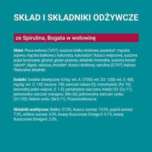 Zbilansowana karma pełnoporcjowa dla kotów po sterylizacji, z wołowiną – głównym składnikiem karmy, źródło niezbędnych białek, wzbogacona spiruliną, pyszne połączenie chrupiących i miękkich krokietów