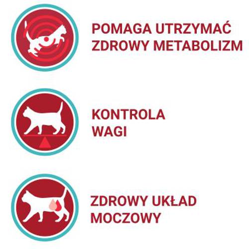 - Kontrola wagi: podwyższona (w porównaniu do innych karm dla dorosłych kotów) zawartość białek i tłuszczu ułatwia utrzymanie optymalnej wagi i beztłuszczowej masy mięśniowej