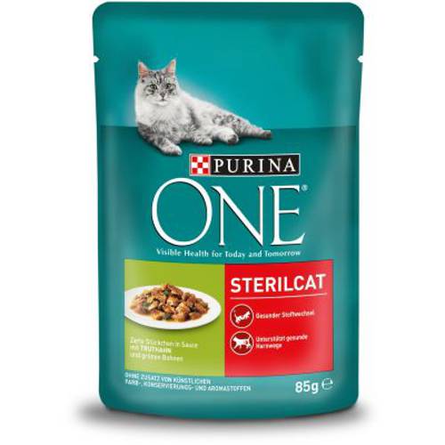Purina ONE Sterilised to zbilansowana karma podstawowa obmyślana specjalnie na potrzeby kotów wysterylizowanych. Kawałki łososia lub indyka z warzywami i delikatnym sosem tworzy wartościowy i smaczny posiłek dla kota. Po kastracji spowalniają się procesy przemiany materii i maleje zapotrzebowanie na składniki energetyczne. Recepturę karmy Purina ONE Sterilised opracowano z pomocą weterynarzy i dietetyków, którzy zadbali o to, by była odpowiednia dla zmieniających się organizmów kotów po kastracji. Karma zawiera optymalną ilość składników energetycznych, dzięki czemu zapobiega przybieraniu na wadze.