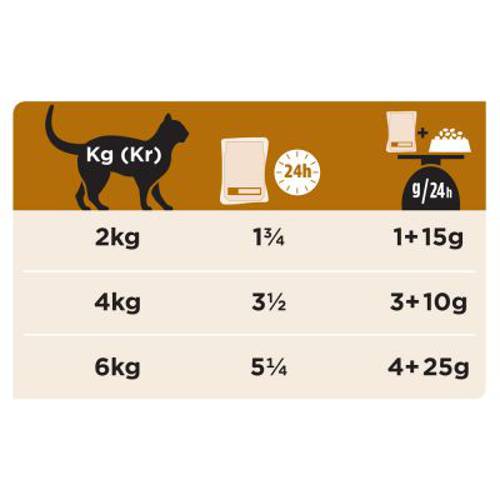 - Umiarkowana zawartość białka: mniejsza ilość – za to wysokiej jakości – białek pomaga zapobiegać gromadzeniu się szkodliwych substancji w organizmie kota i ograniczyć redukcję masy mięśniowej