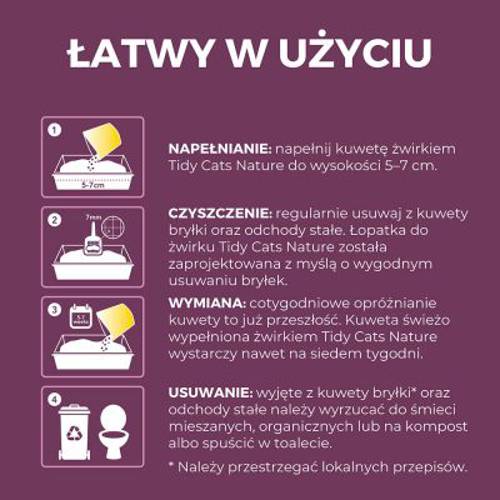 Przyjazny dla środowiska żwirek zbrylający się jest wytwarzany wyłącznie z surowców pochodzących z lasów zarządzanych w sposób zrównoważony. Ponadto jest całkowicie biodegradowalny i dlatego można go kompostować lub wyrzucać do toalety. Dzięki wysokiej chłonności Purina Tidy Cats Nature Classic tworzą się trwałe grudki, które można łatwo usunąć, zostawiając w kuwecie czysty żwirek. Również nieprzyjemne zapachy nie mają szans i są niezawodnie absorbowane.