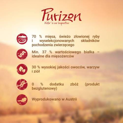 Suche karmy dla psów Purizon zorientowane są na jak najbardziej naturalne żywienie. Purizon to karma jakości premium, która w 70% składa się ze świeżych mięsnych składników, przez co zawiera dużo białka, natomiast nie zawiera zbóż.Purizon staje naprzeciw naturalnych potrzeb Twojego czworonoga! Ponieważ karma składa się w dużej mierze z mięsa, jest optymalna dla rozwoju zębów, żuchwy i przewodu pokarmowego. Przemiana materii podczas mięsnej diety jest też znacznie lepsza i szybsza, niż przy takiej z dodatkiem zbóż.