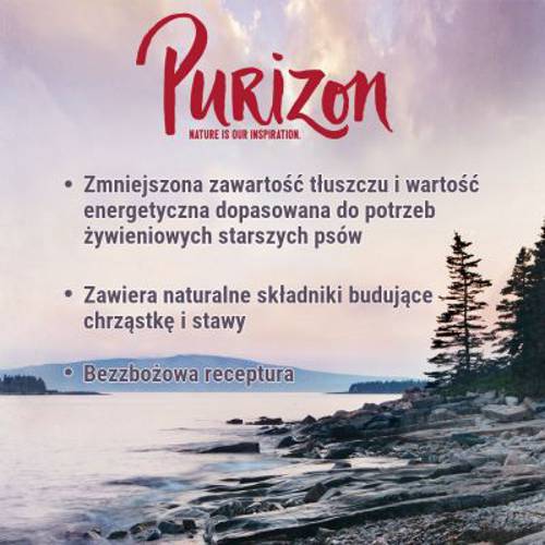 Zmniejszona w karmie Purizon Senior zawartość tłuszczu oraz wartość energetyczna jest dostosowana do poziomu aktywności psów w podeszłym wieku. Ponadto w pokarmie znajdują są naturalne składniki budujące chrząstkę stawową: siarczan chondroityny i glukozamina, by wspomagać sprawność układu kostnego psów w podeszłym wieku.
