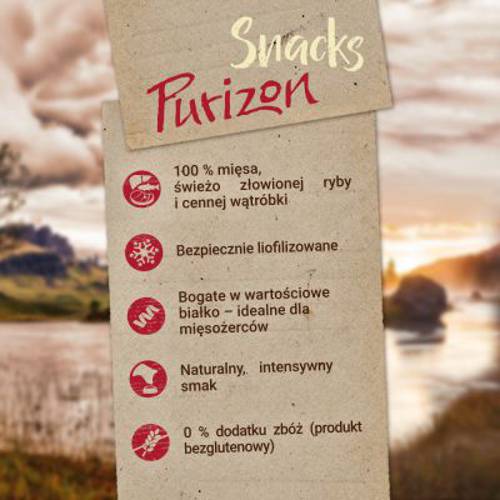 Naturalne żywienie kotów-mięsożerców to główny cel przyświecający marce Purizon. Dlatego przysmaki z linii Purizon Snack (kurczak z rybą) zostały przyrządzone wyłącznie ze świeżego mięsa z kurczaka, delikatnego mięsa z kaczki, świeżo złowionej ryby i wartościowej wątróbki ‒ bez dodatku jakichkolwiek zbóż. Ta wyjątkowa kompozycja składników sprawia, że przysmaki mają delikatną konsystencję i wysoką zawartość białka na poziomie 47%. Prezentowane smakołyki zostały poddane delikatnej obróbce w zaawansowanym procesie liofilizacji. Dzięki temu zachowały wiele substancji odżywczych oraz naturalny, intensywny smak. Nieodparte walory smakowe zapewniają bardzo wysoką akceptację.Purizon Snack – doznania smakowe, o jakich marzą prawdziwi mięsożercy