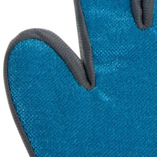 Prezentowana rękawica do pielęgnacji sierści posiada dwie różne strony: z jednej strony znajdują się wypustki, które zapewniają przyjemny efekt masażu, a za pomocą strony z weluru możesz bez problemu ściągnąć sierść. To działa nie tylko podczas zabiegów pielęgnacji sierści, lecz także przy czyszczeniu tapicerki. Za pomocą tej rękawicy bardzo szybko usuniesz sierść, kłaczki i kurz z sofy czy foteli samochodowych. Dwustronna rękawica z palcami jest wyposażona w szeroki, gumowy ściągacz w prosty sposób zapinany za pomocą rzepa.