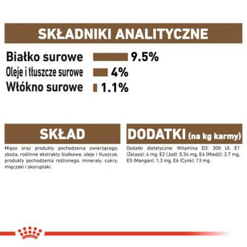 Aby odpowiadać indywidualnym upodobaniom starszych kotów, karma odpowiadająca Royal Canin Ageing 12+ jest dostępna również jako kawałki w galarecie, oraz jako sucha karma. Podając kotu zarówno karmę suchą i mokrą, należy przestrzegać naszych zaleceń żywieniowych. Dzięki temu możesz mieć pewność, że Twój kot otrzyma prawidłową ilość karmy.
