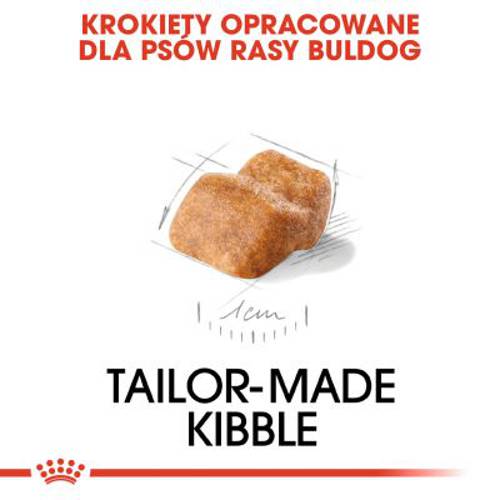 Podczas wrażliwej fazy wzrostu, buldogi potrzebują karmy, która spełnia ich specjalne wymagania żywieniowe oraz może wspierać optymalny rozwój. Sucha karma Royal Canin Breed Bulldog Puppy została opracowana specjalnie dla szczeniąt rasy buldog w wieku do 12 miesięcy. Specjalny kompleks przeciwutleniaczy, wysokiej jakości białka oraz składniki odżywcze mogą wspomagać układ odpornościowy, trawienie oraz witalność Twojego szczeniaka. Dostosowana zawartość wapnia i fosforu może wspomagać kości w fazie rozwoju. Buldogi mają krótki i płaski pysk oraz krótką szczękę (typu brachcefalowego). W związku z tym kształt i wielkość krokietów w karmie zostały dostosowane do kształtu ich szczęki aby ułatwić przyjmowanie pokarmu i zachęcić do dokładnego żucia.
