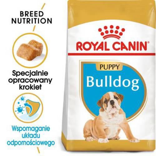 Podczas wrażliwej fazy wzrostu, buldogi potrzebują karmy, która spełnia ich specjalne wymagania żywieniowe oraz może wspierać optymalny rozwój. Sucha karma Royal Canin Breed Bulldog Puppy została opracowana specjalnie dla szczeniąt rasy buldog w wieku do 12 miesięcy. Specjalny kompleks przeciwutleniaczy, wysokiej jakości białka oraz składniki odżywcze mogą wspomagać układ odpornościowy, trawienie oraz witalność Twojego szczeniaka. Dostosowana zawartość wapnia i fosforu może wspomagać kości w fazie rozwoju. Buldogi mają krótki i płaski pysk oraz krótką szczękę (typu brachcefalowego). W związku z tym kształt i wielkość krokietów w karmie zostały dostosowane do kształtu ich szczęki aby ułatwić przyjmowanie pokarmu i zachęcić do dokładnego żucia.