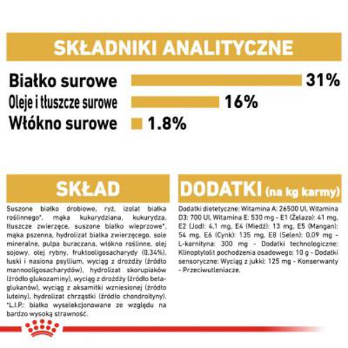 - Wysoka strawność: białka L.I.P. i prebiotyki mogą wspomagać zdrowe trawienie, zrównoważoną florę bakteryjną jelit oraz dobrą jakość stolca.