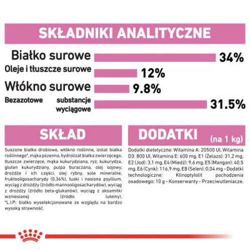 Royal Canin Kitten Sterilised została stworzona specjalnie z myślą o zaspokojeniu szczególnych potrzeb wysterylizowanych kociąt. Zawiera połączenie opatentowanego kompleksu przeciwutleniaczy z ważnymi proteinami, witaminami i minerałami. Taka kombinacja pozwala na wspieranie zdrowia Twojego kotka już od pierwszego roku jego życia i sprawia, że wyrasta na silnego i zdrowego kota.