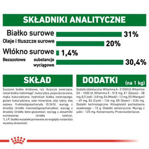 Wysoka wartość energetyczna Royal Canin Mini Puppy jest ukierunkowana na szybki i intensywny wzrost oraz związane z tym zwiększone zapotrzebowanie energetyczne szczeniąt małych ras. W 10. miesiącu szczenię kończy budowę mięśni i wzmacnia kości, dlatego ma 1,6 razy więcej energii niż dorosły pies. Spożycie kalorii jest dostosowywane, aby zmniejszyć ryzyko zbyt szybkiego przybierania na wadze.