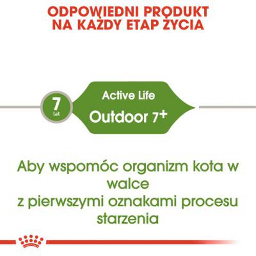 Koty wychodzące często pozostają aktywne nawet w zaawansowanym wieku. Jednakże od 7 roku życia pojawiają się u nich pierwsze objawy procesów starzenia. Aby nie towarzyszył im spadek aktywności i witalności warto zastosować karmę opracowaną z myślą o zaspokojeniu takich potrzeb – Royal Canin Outdoor 7+.