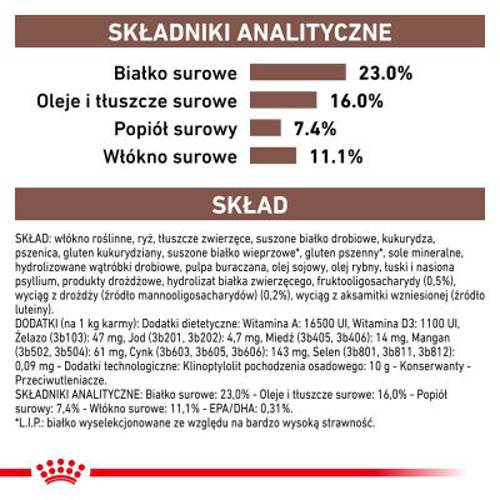 - Dostosowana zawartość energii i elektrolitów: zapewnia psu wystarczającą ilość energii i składników odżywczych.
