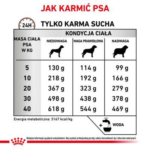 - Dostosowana zawartość energii i elektrolitów: zapewnia psu wystarczającą ilość energii i składników odżywczych.