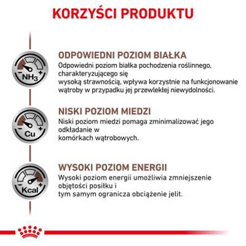 - Dietetyczna karma pełnoporcjowa dla psów wspomagająca czynność wątroby w przewlekłej niewydolności wątroby oraz zmniejszająca magazynowanie miedzi w wątrobie.