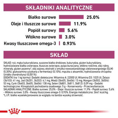 Sucha karma zawiera umiarkowaną wartość energetyczną w celu wspierania utrzymania idealnej wagi. Może to pomóc w zmniejszeniu ryzyka otyłości i odciążyć stawy. Ponadto w składzie ekstrakt z omułka zielonowargowego, która zawiera między innymi glukozaminę jako naturalny składnik stawów. Cenne kwasy tłuszczowe omega-3 mogą również przyczynić się do prawidłowego funkcjonowania stawów.