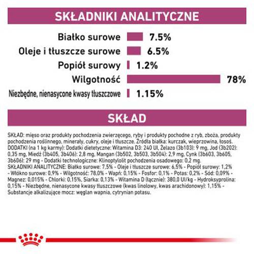 Dietetyczna karma mokra dla kotów cierpiących na przewlekłą niewydolność nerek, ogranicza tworzenie się kamieni szczawianowych, obniżona zawartość fosforu i wapnia, umiarkowana zawartość białka, wspomaga pracę nerek