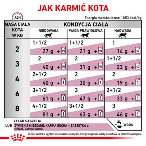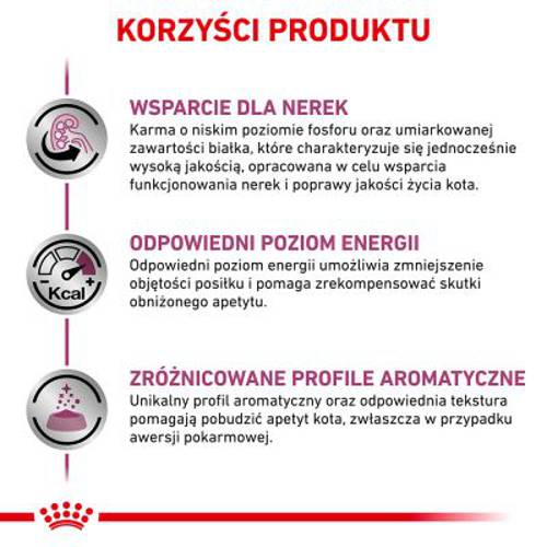 - Dietetyczna, pełnoporcjowa karma dla dorosłych kotów, wspomagająca czynność nerek w przewlekłej niewydolności nerek oraz ograniczająca powstawanie kamieni szczawianowych.