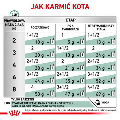 - W trakcie podawania karmy weterynaryjnej konieczne są regularne (co 6 miesięcy) wizyty kontrolne u weterynarza.