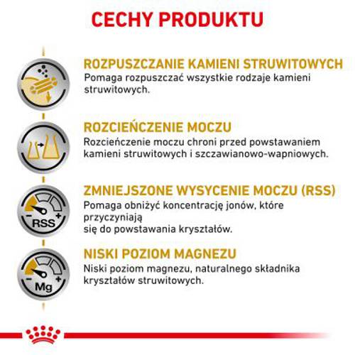 Właściwości dietetycznej karmy dla kotów polegające na zakwaszaniu moczu mogą pomóc w rozpuszczaniu istniejących kamieni struwitowych. Jest to karma również uboga w magnez, który jest naturalnym składnikiem kamieni struwitowych. Wraz z niską wartością RSS, karma Royal Canin Veterinary Feline Urinar S/O może przyczynić się do stworzenia środowiska moczu, które jest niekorzystne dla powstawania kamieni struwitowych.