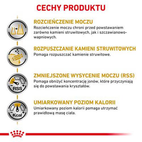 Dietetyczna mokra karma dla kotów, wspomaga rozpuszczanie kamieni struwitowych, ogranicza nawroty kamicy struwitowej, umiarkowana wartość energetyczna dla kontroli masy ciała, zakwasza mocz, mała ilość magnezu.