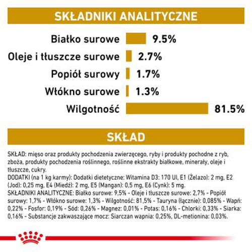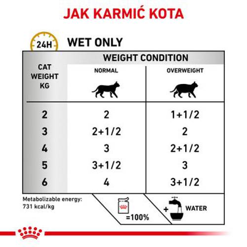 Dieta ta charakteryzuje się niską zawartością magnezu i ma właściwości zakwaszające oraz rozrzedzające mocz. Mokra karma Royal Canin Veterinary Feline Urinary S/O Moderate Calorie pomaga stworzyć takie środowisko moczu, które jest niekorzystne dla powstawania kamieni moczowych i sprzyja rozpuszczaniu kamieni struwitowych. Zawartość kalorii w dietetycznej karmie mokrej jest umiarkowana, co ułatwia kontrolę masy ciała.
