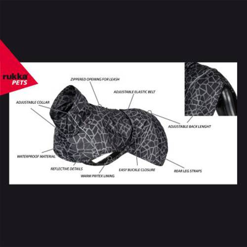 Płaszcz dla psa jest wykonany z wiatroszczelnego i wodoodpornego materiału, a od wewnątrz podszyty jest oddychającym polarem Pritex. Wysoki kołnierz i śliniaczek zapewniają psu optymalną ochronę, a elastyczny pas biodrowy zapewnia wysoki komfort noszenia. Płaszcz przeciwdeszczowy Rukka® Hayton Warm można bezstopniowo regulować na długości pleców, a także przy szyi i kołnierzu. W celu zapewnienia bezpieczeństwa, zwłaszcza przy złej, deszczowej pogodzie, kurtka została wyposażona w odblaskową lamówkę.