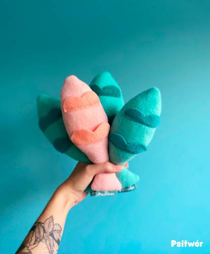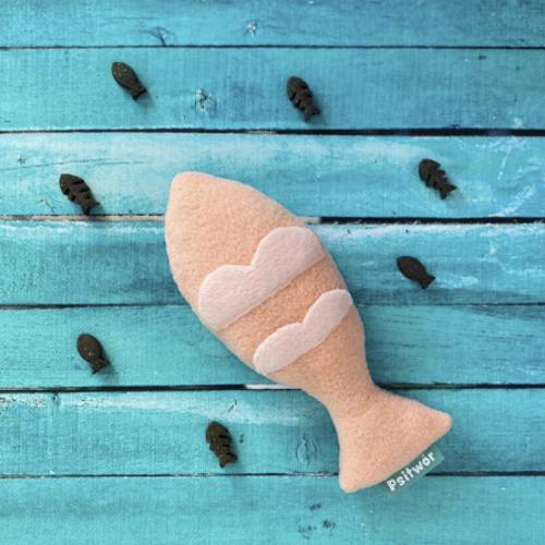 Zabawka rybka uszyta z polaru, wypełniona w środku ścinkami materiału.