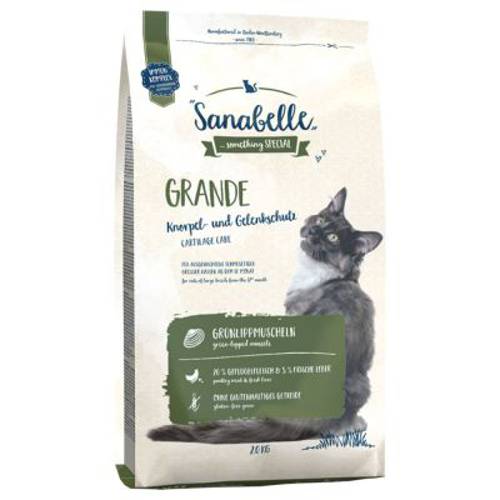 Sanabelle Grande jest karmą przygotowaną specjalnie dla kotów dużych ras. Odpowiednia struktura i duży rozmiar krokietów zapobiegają zbyt szybkiemu pochłanianiu pokarmu, a konieczność dokładnego rozdrobnienia pożywienia doskonale wspiera higienę zębów kota. 20% świeżego drobiu i 5% świeżej wątróbki odpowiadają za dostarczenie wartościowych zwierzęcych białek i świetny smak.Koty dużych ras mają często problemy ze stawami. Zawarte w karmie sproszkowane małże zielone są wyjątkowo bogatym źródłem naturalnych składników budulcowych chrząstek: chondroityny i glukozaminy, która odpowiedzialna jest za właściwą budowę chrząstek, ich sprawność i ruchomość.