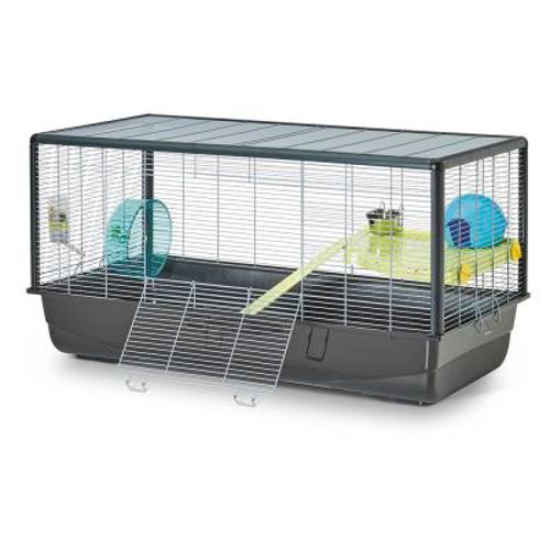 Zwierzęta mają dostęp do podwyższonej platformy, na której znajduje się mała budka do schowania się oraz miska na karmę. W zestawie znajdują się również kołowrotek dla chomika i butelka do picia, które można łatwo przypiąć do kratki. Dzięki dużym drzwiczkom z przodu można łatwo wymienić siano, wyczyścić wnętrze lub pogłaskać swojego małego pupila.