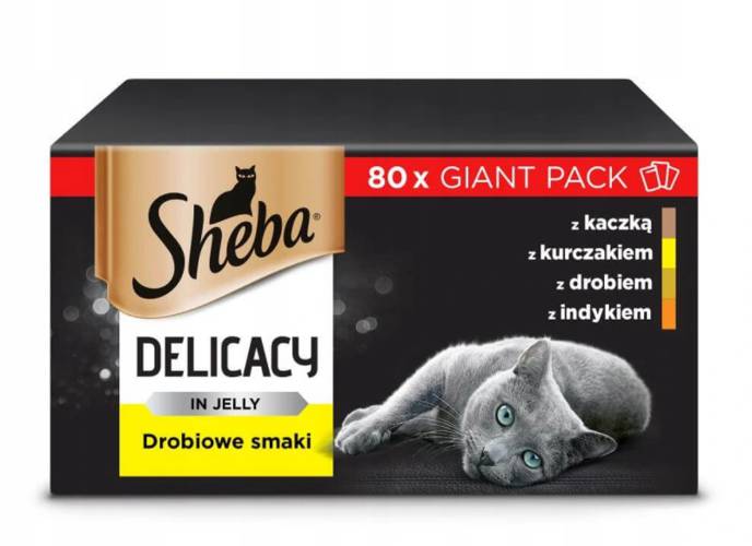 Sheba Delicacy Drobiowe Smaki w galaretce 80*85g SHEBA® Delicacy Drobiowe smaki to starannie przygotowane, delikatne płatki, zanurzone w apetycznie rozpływającej się galaretce z kaczką, z kurczakiem, z drobiem i z indykiem. Ta pełnoporcjowa karma nie zawiera zbóż i ma wyjątkową teksturę oraz nieod…