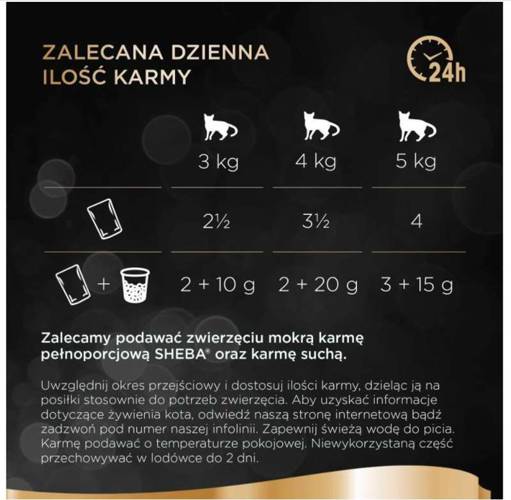 Kot o masie ciała 3 kg potrzebuje 2½ saszetki karmy mokrej lub 2 saszetek karmy mokrej i 10 g karmy suchej dziennie, kot o masie ciała 4 kg potrzebuje 3½ saszetek karmy mokrej lub 2 saszetek karmy mokrej i 20 g karmy suchej dziennie, kot o masie ciała 5 kg potrzebuje 4 saszetek karmy mokrej lub 3 saszetek karmy mokrej i 15 g karmy suchej dziennie. Ilości karmy są podane wyłącznie jako wskazówki. Należy dostosować ilość karmy do wieku, rozmiaru i poziomu aktywności kota. Karmę podzielić na porcje do podania w ciągu dnia. Pamiętaj, aby zapewnić zwierzęciu świeżą wodę do picia. Karmę podawać o temperaturze pokojowej. Niewykorzystaną część przechowywać w lodówce do 2
