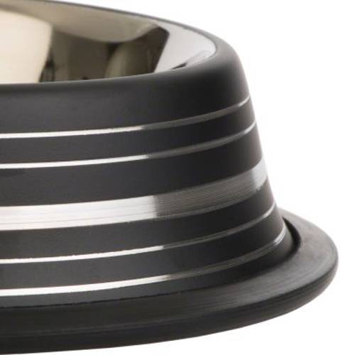 Stalowa miska na pokarm wykonana ze stali szlachetnej zdobiona wzorkiem z pasków, kolor czarny matowy/srebrny, obręcz antypoślizgowa dla stabilnego utrzymaniaTa szlachetnie zaprojektowana miska w matowym czarnym kolorze zdobiona dla kontrastu srebrnymi paskami doda blasku do miejsca spożywania posi…