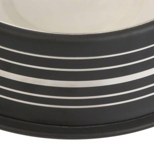 Stalowa miska na pokarm wykonana ze stali szlachetnej zdobiona wzorkiem z pasków, kolor czarny matowy/srebrny, obręcz antypoślizgowa dla stabilnego utrzymaniaTa szlachetnie zaprojektowana miska w matowym czarnym kolorze zdobiona dla kontrastu srebrnymi paskami doda blasku do miejsca spożywania posi…