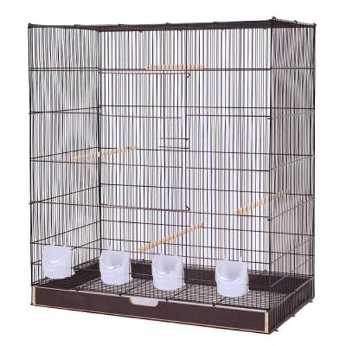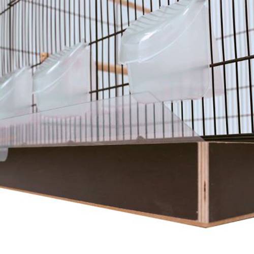 Klatka do użytku wewnętrznego dla papużek falistych i kanarków, wysuwana drewniana szuflada z dnem z pleksiglasu, duża klapa do lądowania, z kilkoma grzędami i karmnikami, składana