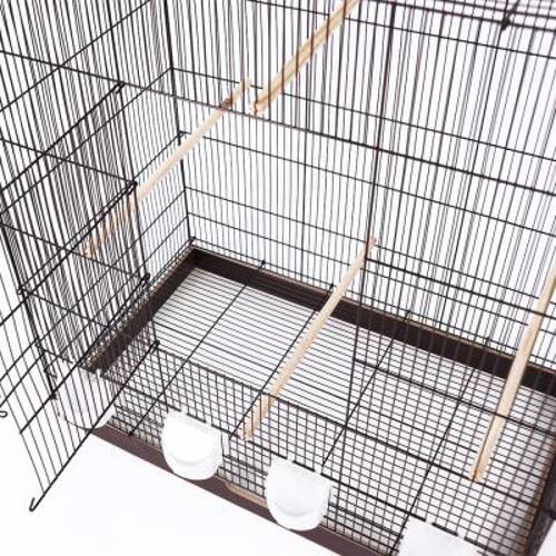 Klatka do użytku wewnętrznego dla papużek falistych i kanarków, wysuwana drewniana szuflada z dnem z pleksiglasu, duża klapa do lądowania, z kilkoma grzędami i karmnikami, składana