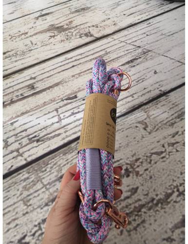 Smycz linowa to połączenie elegancji i praktyczności. Kolor dominujący fuksja i fiolet z domieszką jasnoniebieskiego fioletu w połączeniu w różowozłotymi okuciami to TOP-owy produkt dla Twojego psa. Smycz została wykonana ręcznie. Szerokość linki 10 mm jest dostosowana do wielkości karabinka 7,0 cm…