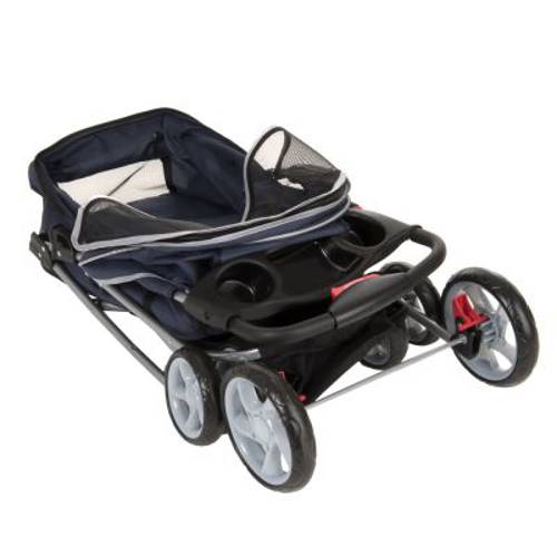 Komfortowy wózek do transportowania małych lub chorych psów o wadze do 15 kg. Idealny na długie spacery, podróże, wycieczki do miasta, składany. Ciemnoniebieski / jasnoszary