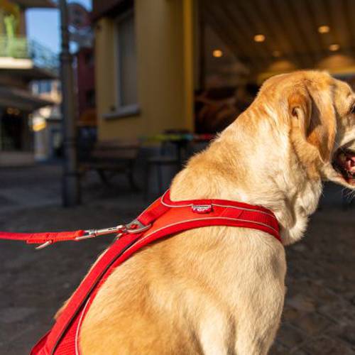 Czerwone szelki w kształcie litery Y są wykonane z wytrzymałego poliestru i mogą wytrzymać duże obciążenia. Latem mogą przyjemnie chłodzić, jeśli przed założeniem namoczysz je w zimnej wodzie. Wyściełany uchwyt z tyłu pozwala trzymać psa blisko siebie, gdy jest to konieczne. Osłona sprzączki zapobiegająca przypadkowemu otwarciu oraz odblaskowa lamówka również przyczyniają się do większego bezpieczeństwa psa.