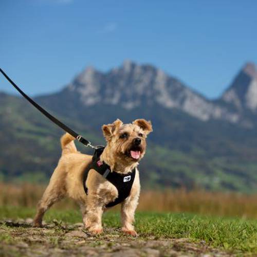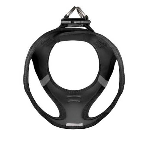 Czarne szelki step-in dla małych psów, wygodny materiał, lekki i przepuszczający powietrze, regulowane, z praktycznym identyfikatorem DogFinder ID, optymalny rozkład napięcia, wykonany z poliestru